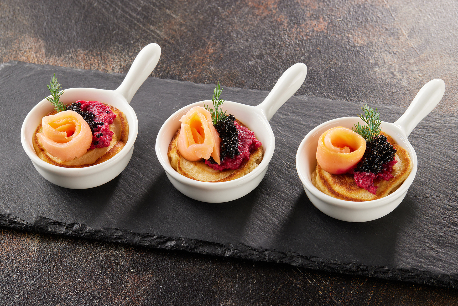 Чипс из пармезана с луковым джемом, прошутто и икрой из базелика